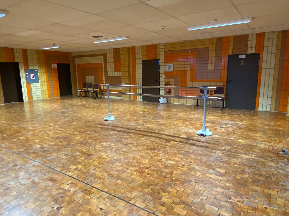 Partyraum, gegenüber der Turnhalle die kleine Treppe runter gehen.